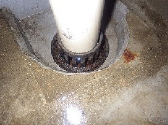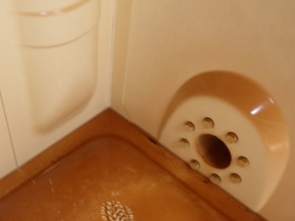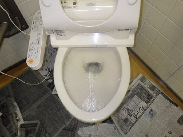 使用後の排水が流れず便器から溢れてしまっています。