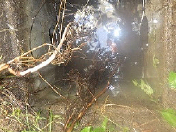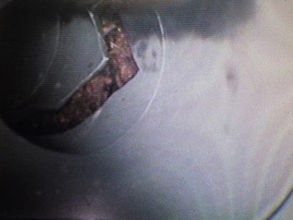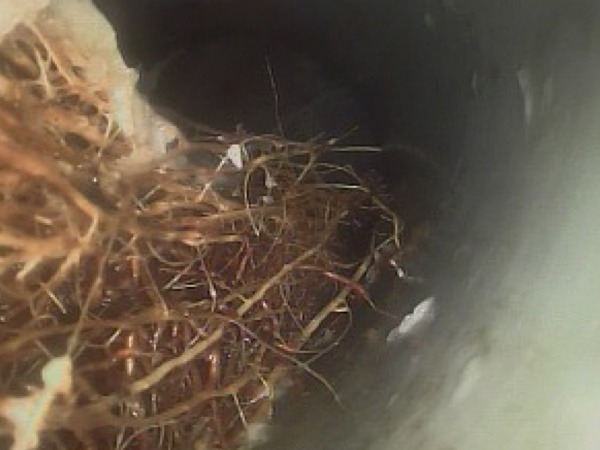 ファイバースコープの画面で内部を確認しながら進めていき、原因のある破損カ所の特定をしました。木の根が管やマンホールの破損部から入り込み、管内を閉塞させる原因になります。定期的な洗管をすることで閉塞は予防できますが、早い段階での破損部の補修をお勧めしています。